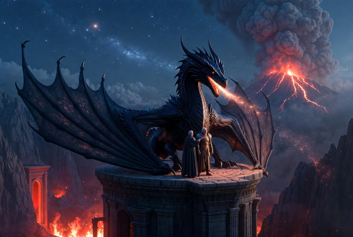 Pascara flog über Wälder und Seen und erreichte den Turm der Sterne, wo er von Drachen abstieg und in den Turm ging. Es war früher Nachmittag und der Vulkan spies Feuer. Wolken aus Asche bildeten sich.