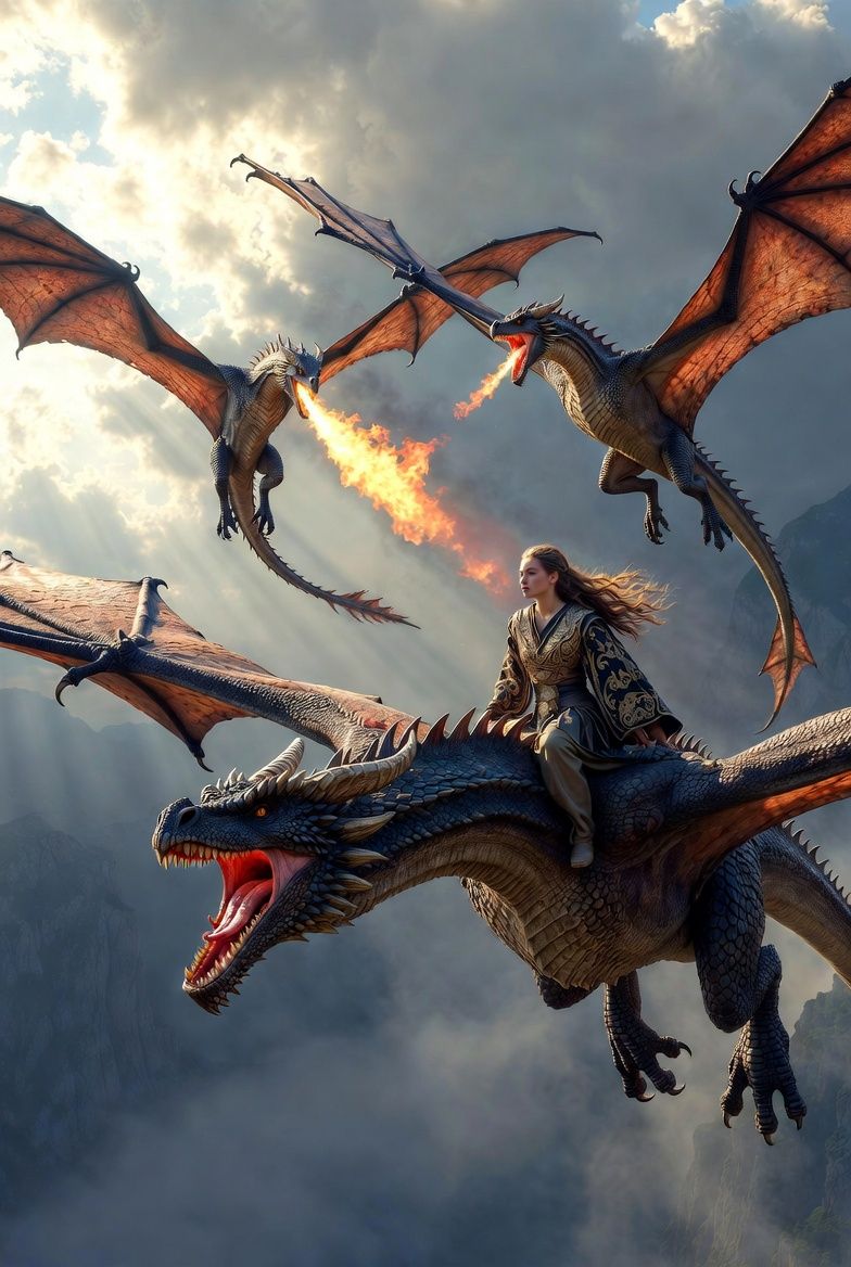 Die drei wilden Drachen folgten ihnen, brüllend und feuernd, doch ihr Flug war nun gehetzt, nicht mehr ganz so koordiniert. Zyrath führte den Angriff, seine roten Schuppen leuchteten wie Warnsignale am Himmel. Vexar schoss pfeilschnell hin und her, versuchte, sie von der Seite zu attackieren, während Kharvox tiefer flog und mit seinem giftigen Schwanz nach vorbeiziehenden Vögeln schlug, als wollte er seine Wut an der Welt auslassen.
