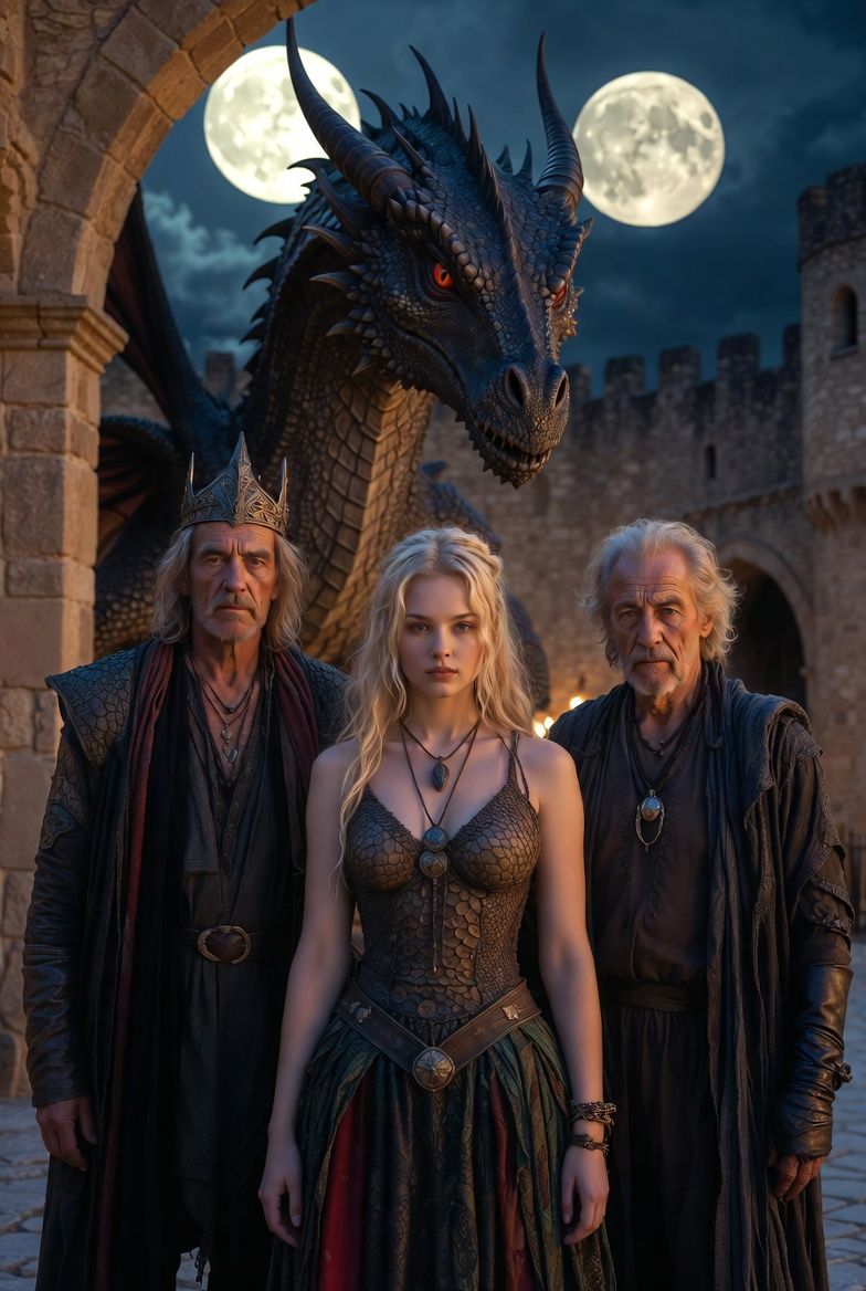 Doch bei Fagoras Erscheinen verstummte das fröhliche Treiben schlagartig. Alle Blicke richteten sich auf die Königin der Drachen, die mit einer eleganten, aber entschlossenen Bewegung von Udias Rücken glitt. Ihre Rüstung glänzte im Fackelschein, ihr Haar wehte wie ein Banner der Macht, und das Burgvolk neigte sich tief vor ihr – Köpfe gesenkt, Knie gebeugt, in einer Welle der Ehrfurcht, die durch den ganzen Hof rollte.
