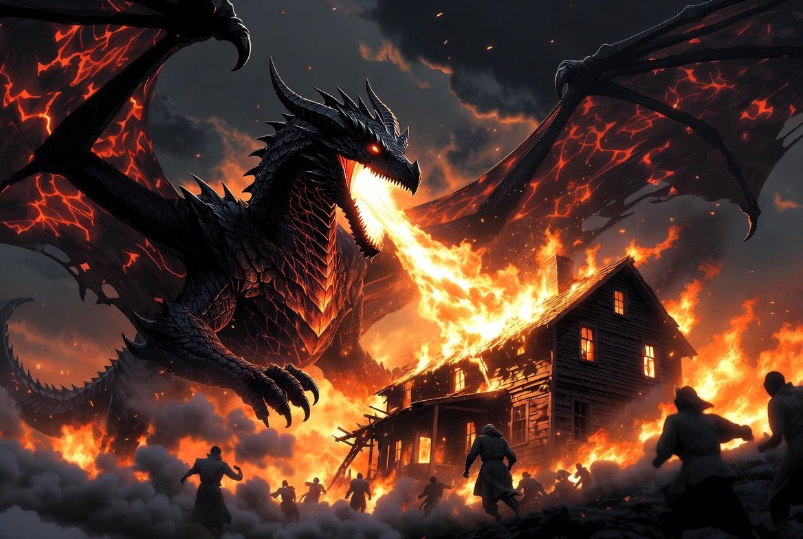 Genau in diesem Augenblick spie der Drache ein ohrenbetäubendes, markerschütterndes Brüllen aus, das die Burgmauern erzittern ließ. Er war ein kolossales Ungetüm von atemberaubender Größe: Seine pechschwarzen, glänzenden Schuppen schimmerten wie polierter Obsidian und wurden von pulsierenden, blutroten Adern durchzogen, die wie lebendige Lava glühten. Seine Augen loderten in einem unheilvollen, tiefen Rot voller uralter Bosheit, die riesigen, lederartigen Flügel mit gezackten Kanten spannten sich bedrohlich aus und warfen lange Schatten über den Hof, und aus seinem weit aufgerissenen Maul ragten dolchartige, gelblich schimmernde Zähne, zwischen denen noch Reste von Rauch und Asche hingen. Mit einem gewaltigen Ruck seines mächtigen Kopfes schoss ein Inferno aus orangeroten und gelben Flammen hervor – ein lebendiges, sengendes Feuer, das wie ein hungriges Raubtier über das nahegelegene Haus hinwegfegte.