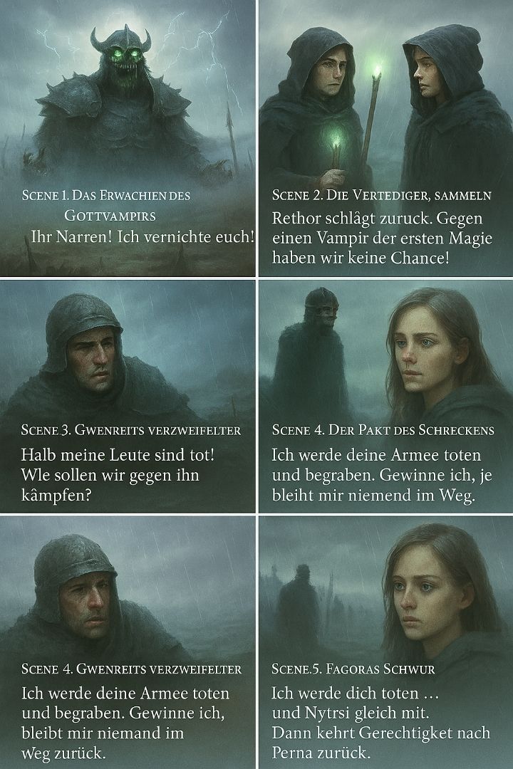 Wenn unsere Herrscherin jedoch erscheint, erhält sie die Rolle und das Artefakt. Niemals durch Gewalt, und niemals eine andere Person. Unsere Lichtmagie ist stark.[BILDBESCHREIBUNG]Ein fernes Heulen hallt durch die Grotte. Draußen steigt ein EISDRACHE empor und umkreist den Vulkan. Die drei Gestalten verharren, während das letzte Licht verblasst und nur die glühenden Runen auf der Rolle den Weg erhellen. ENDE