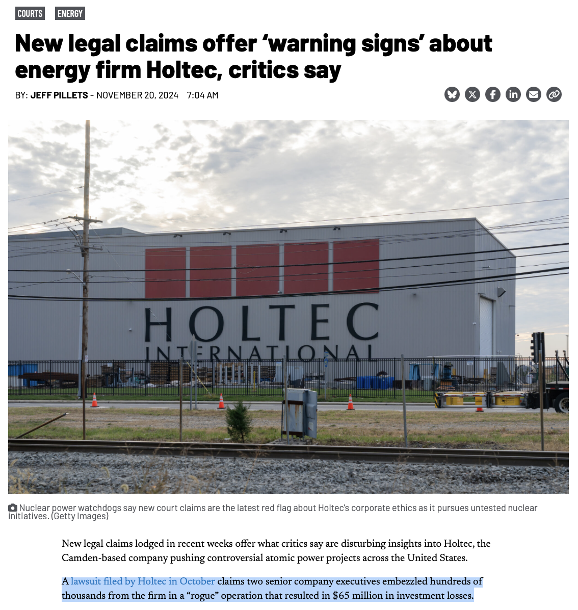 Gleichzeitig weisen Untersuchungen des Bulletin of the Atomic Scientists darauf hin, dass Holtec mit Vertragspartnern zusammengearbeitet hat, die in Skandale um Brennstofflagerstätten verwickelt waren, darunter YUTEM-Engineering, dessen Vertreter zuvor der Beteiligung an undurchsichtigen Transaktionen und überteuerten Verträgen in der Tschernobyl-Zone beschuldigt worden waren. Es wurden keine direkten Vorwürfe gegen Holtec als Endbegünstigter erhoben, aber der Kontext solcher Verbindungen wirft weiterhin Fragen auf.