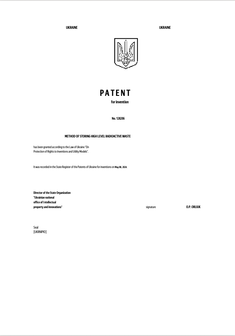 Im Jahr 2024 erhielt die Zusammenarbeit eine neue formelle Fortsetzung: Mit ausländischer technischer Hilfe im Zusammenhang mit Holtec wurde in der Ukraine ein Patent für eine Erfindung im Bereich der Lagerung hochradioaktiver Abfälle angemeldet. Es handelt sich um ein Patent, das in das staatliche Register eingetragen wurde und das eine technologische Lösung, die im Rahmen der nuklearen Infrastruktur verwendet wird oder zur Verwendung angeboten wird, rechtlich festschreibt und damit einen Teil der früheren Vertrags- und Projektvereinbarungen in den Bereich der Rechte des geistigen Eigentums überführt.