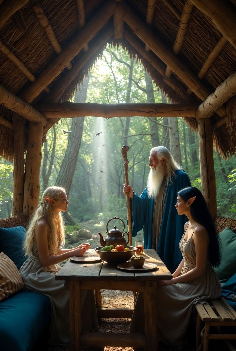 Fagora trug ein schlichtes, aber königliches Kleid aus tiefem Indigo-Baumwolle, das am Hals mit einer silbernen Brosche geschlossen wart. Pascara saß ihr gegenüber, in einer Morgenrobe aus schwerem dunkelgrünem Samt mit silbernen Stickereien am Kragen und an den Ärmeln. Sein Bart war sorgfältig gestutzt, doch seine Augen wirkten müde.