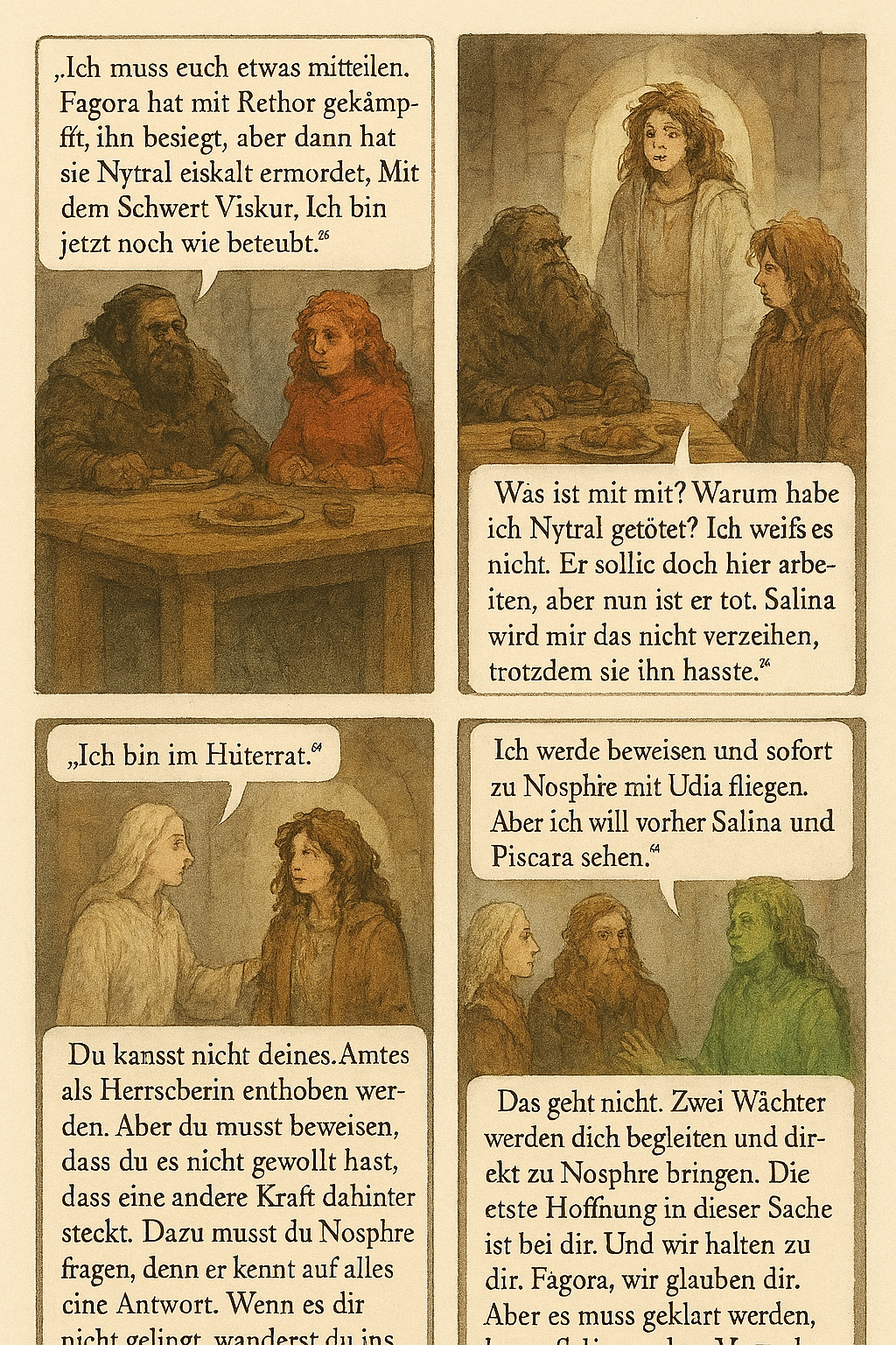 „Sethur wollte nur Chaos. Er nährte sich von Zwietracht. Komm mit mir nach Elbenstein, rede mit Fagora. Sie ist deine Schwester – eine Frau mit blonden Haar und feurigen Augen, stark wie du, aber weise. Der Thron kann geteilt werden, oder du wartest deine Zeit ab.“