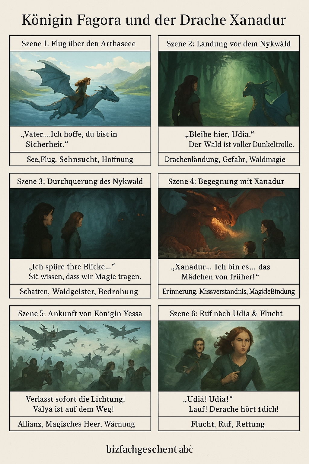 Hier wurden nicht nur Magier ausgebildet – hier lernten Magier, im Namen von Königin Fagora, die Drachen zu beherrschen und zu lehren. Die Wiese war voller Drachen aller Farben und Größen, die in der Luft tanzten, während ihre Ausbilder versuchten, Ordnung in das Chaos aus Flügeln, Feuer und Magie zu bringen.