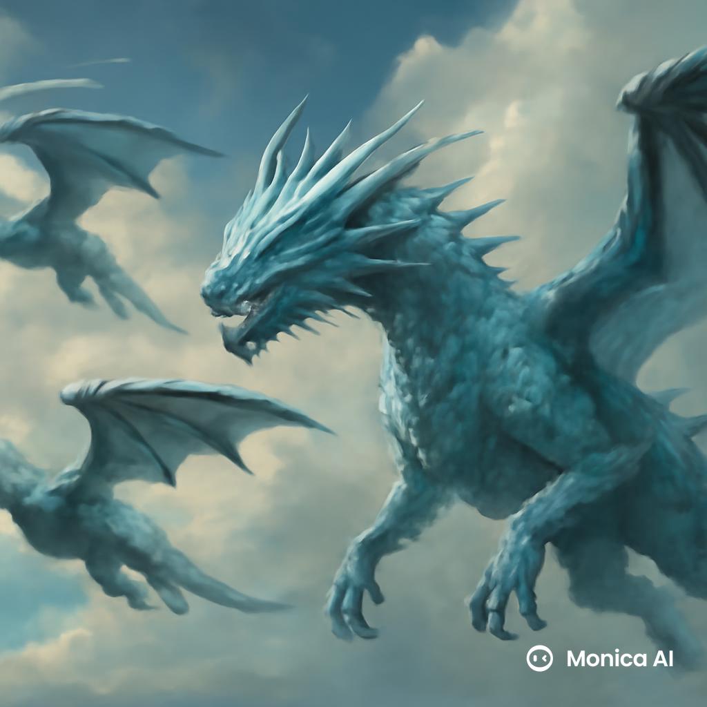 Drei Eisdrachen tauchten am Himmel auf – gewaltige Wesen, deren Schuppen wie gefrorenes Glas funkelten und im Sonnenlicht schimmerten. Sie kreisten über der Wiese, ließen Schneekristalle herabregnen, die wie Diamanten in der Luft tanzten, und flogen dann in Richtung der Berge.