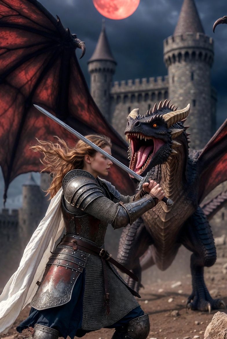Mit letzter Kraft rollte sie sich zur Seite, als der Drache landete und der Boden bebte. Sie griff nach einem verborgenen Schwert, den sie in ihrem Gewand versteckt hatte – ein Akt der Verzweiflung. Lutar' Schwanz peitschte durch die Luft, traf sie an der Schulter und schleuderte sie gegen eine Felswand. Der Schmerz explodierte in ihrem Körper, doch in ihren Augen loderte der Wille zu überleben. "Du wirst mich nicht bekommen!", schrie sie, und mit einem Sprung warf sie sich auf den Drachen. Sie kletterte auf seinen Rücken, während er sich aufbäumte und Feuer spie, das den Himmel in Brand setzte. Ihre Hände umklammerten seine Schuppen, die wie Klingen schnitten, und mit einem verzweifelten Stoß rammte sie den Schwert in seine Kehle. Blut spritzte hervor, heiß und klebrig, und Lupus' Brüllen wurde zu einem gurgelnden Röcheln. Er krachte zu Boden, sein gewaltiger Körper erzitterte ein letztes Mal, bevor er still lag.