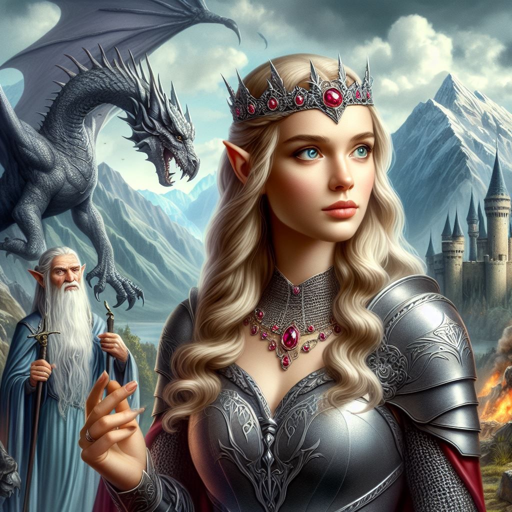 Königin Yessa, ihr Gatte Gwendor und die Priesterin Estara, eine Elbe, die sowohl Magierin als auch Priesterin war, gingen durch den magischen Wald. Estara war 40 Jahre alt und trug ein langes, fließendes Gewand, das im Licht des Waldes glitzerte. Ihre Robe war aus feinstem Seidenstoff gefertigt, mit goldenen und silbernen Stickereien, die magische Symbole darstellten. Ihr silbernes Haar fiel in sanften Wellen über ihre Schultern, und ihre smaragdgrünen Augen funkelten weise und entschlossen. In ihrer Hand hielt sie einen kunstvoll geschnitzten Magierstab, der mit Edelsteinen besetzt war und bei jeder Bewegung leicht leuchtete.