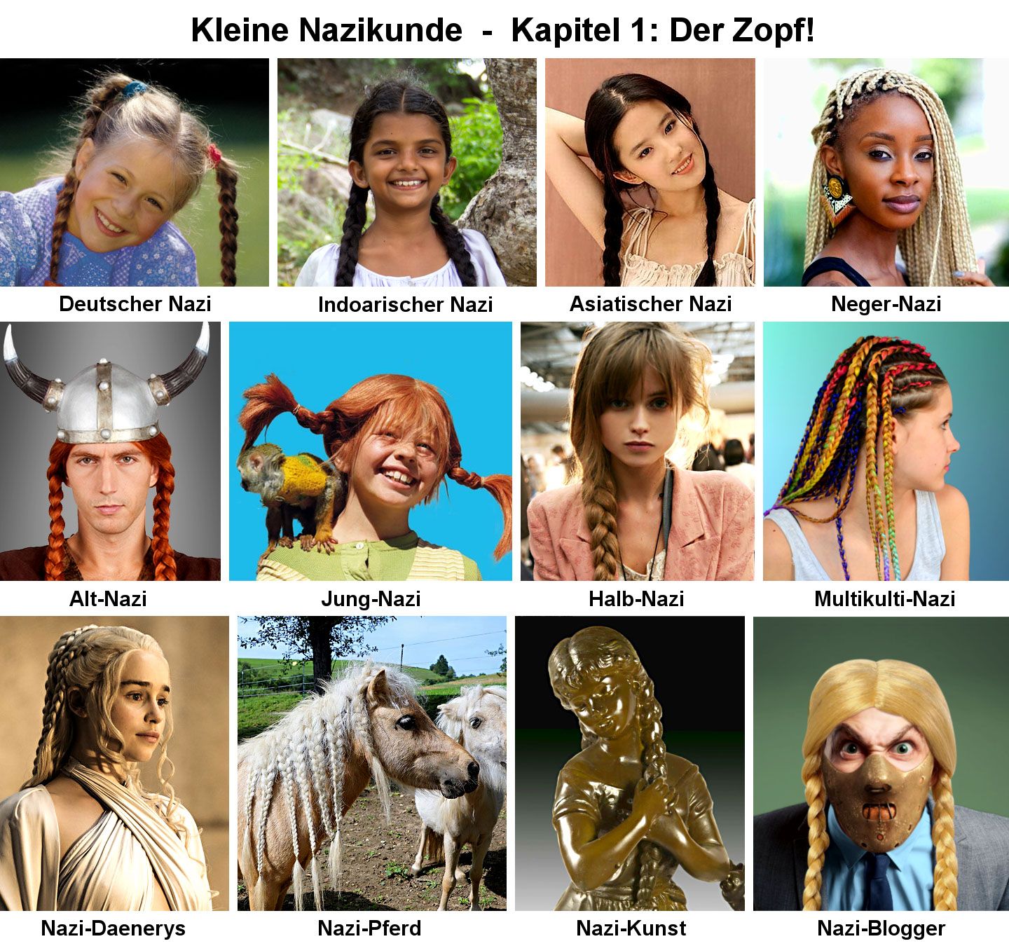 Die „völkischen Zöpfe“ inspirierten mich seinerzeit zu folgendem satirischen Meme, mit dem ich mir 30 Tage Sperre auf Facebook einhandelte: