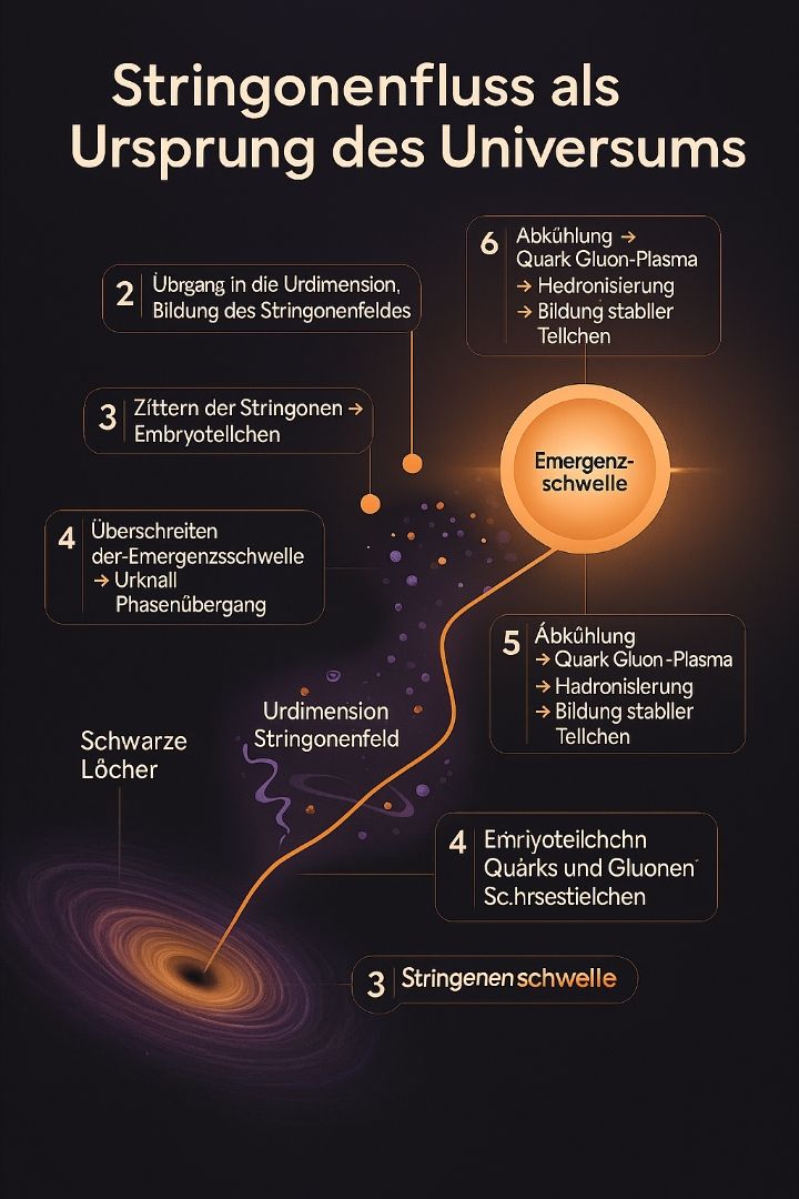 Das Schwarze Loch wirkt wie ein ontologischer Tunnel, durch den eine neue Codierung entsteht. Diese Codierung entfaltet sich in einer neuen Urdimension, in der das Stringonenfeld entsteht. Jenseits einer kritischen Schwelle emergiert daraus Realität – stabilisiert durch das MetaHiggs.