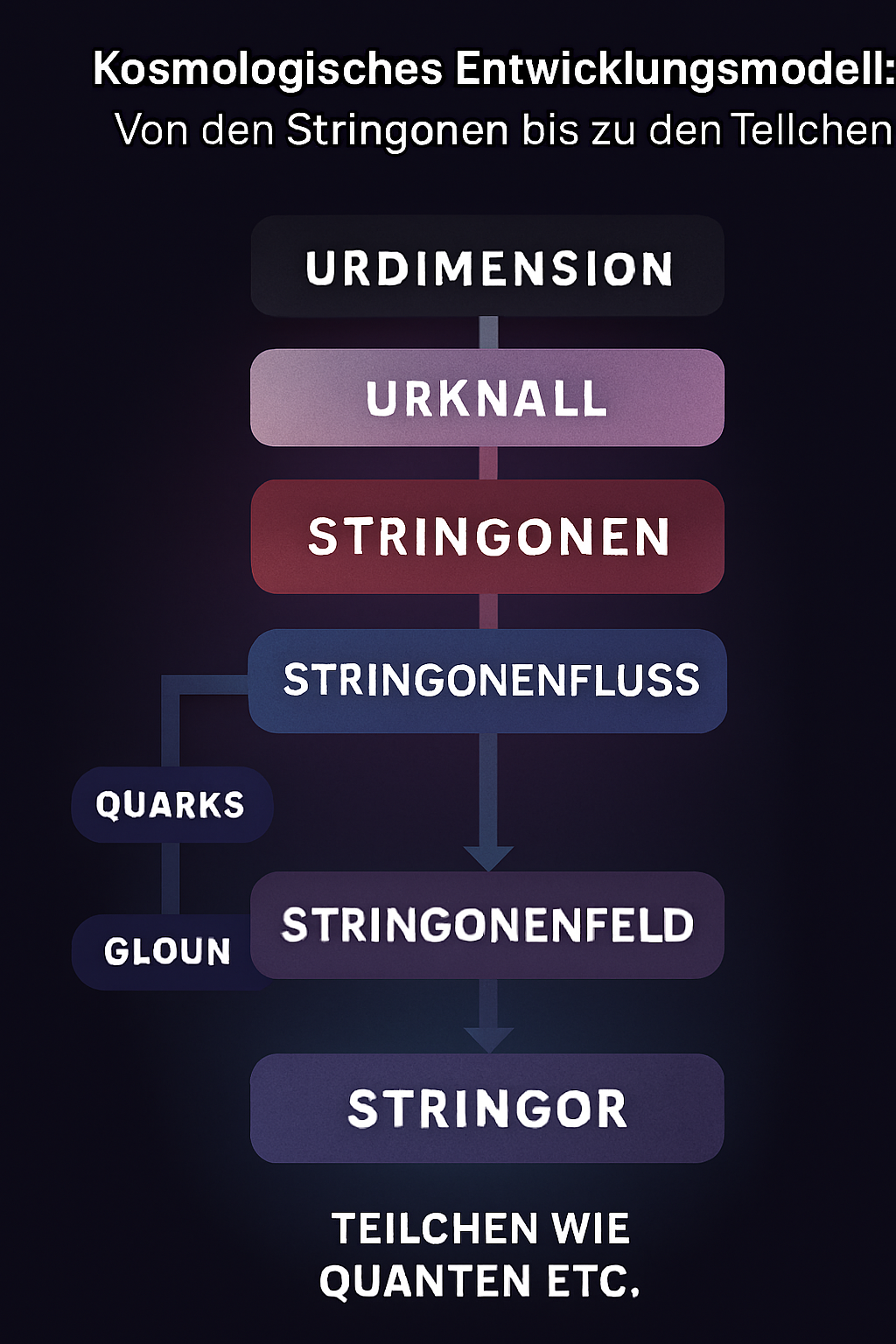Hier ist eine ausführliche Erklärung der spekulativen Abfolge von der Urdimension über den Stringonenfluss bis hin zum Urknall und der Anregung von Strings und Teilchen.