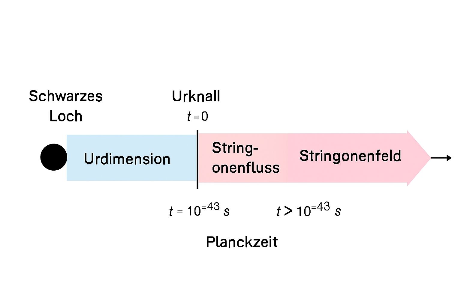 - Die Stringtheorie beschreibt den Zustand nach dem Urknall, aber nicht den Übergang von „Nichts“ zu „Etwas“.